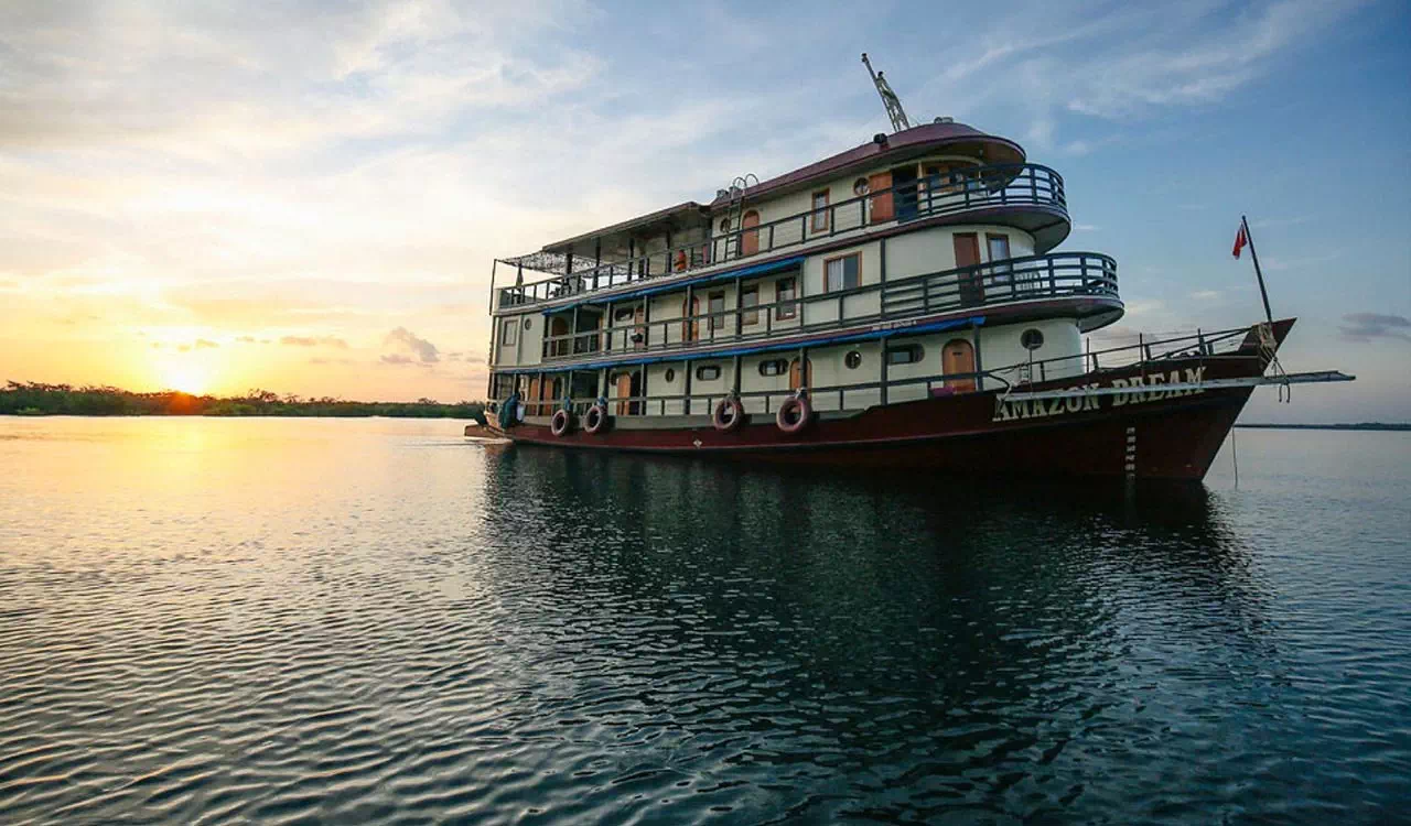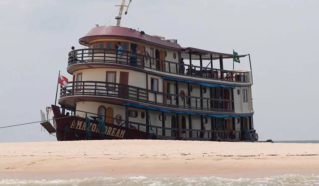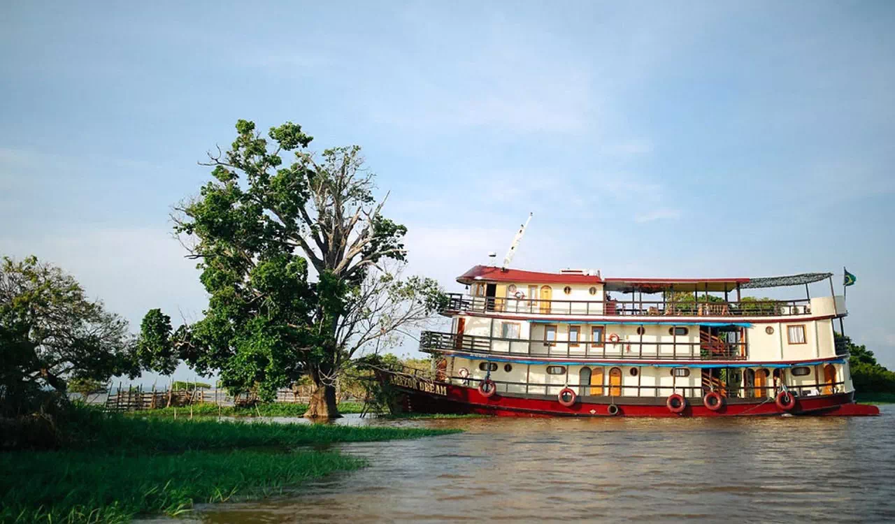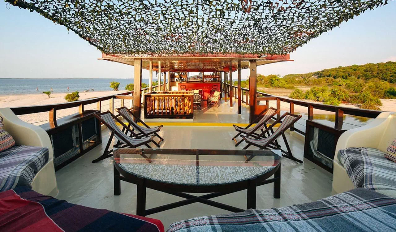 Chacune des neuf cabines, décorée différemment, ponctuée d’objets indiens, offre une vue superbe sur les paysages traversés. Spacieuses, 12 à 14 m2 avec une hauteur de 2,10 m, elles disposent d’une salle de bain et de toilettes et sont toutes climatisées. L’architecture intérieure du bateau donne priorité à la lumière, aux bois exotiques, à la couleur des tissus et son aménagement permet à chaque hôte de vivre à son rythme. Dans le salon-bibliothèque, où aquarelles et gravures font revivre l’histoire de l’Amazonie, on se plonge avec passion dans les récits de voyage des grandes expéditions. Sur le pont supérieur, le bar ouvre sur le grand spectacle de la nature et propose de délicieux cocktails de fruits amazoniens aux goûts exotiques : cupuaçu, graviola, maracuja, acerola… et l’incontournable caïpirinha… Le solarium avec ses chaises longues invitent au farniente, bercé par les eaux…