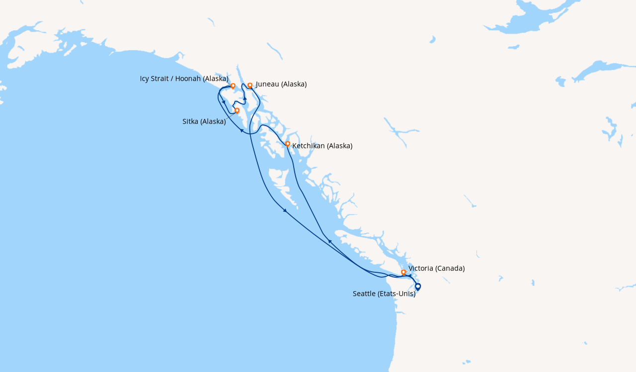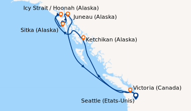 Nous avons embarqué ce mois-ci, mon agent m'a proposé un package vol+croisière depuis Paris alors on a tenté l'experience pour changer de la méditerranée.Et c’est surement le plus grand navire de croisière sur lequel nous ayons navigué.  Les points positifs: de jolies cabines et une configuration de salle de bains assez astucieuse, cela dit les espaces de rangement trop petits, surtout quand on est 2 !.. un détail qui gache la vie à bord: l'ascenseur à l'attente interminable.. côté itinéraire, le escales sont bien choiseies, avec pas trop de journées en mer. Ketchikan, juneau et icy strait (port privé) rasseble tout ce qu'on aime dans le nord de l'amérique: de l'espace, des montagnes, de l'air pur et des gens vraiment sympas, à condition de parler anglais un minimum. voila pour mon avis !
