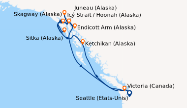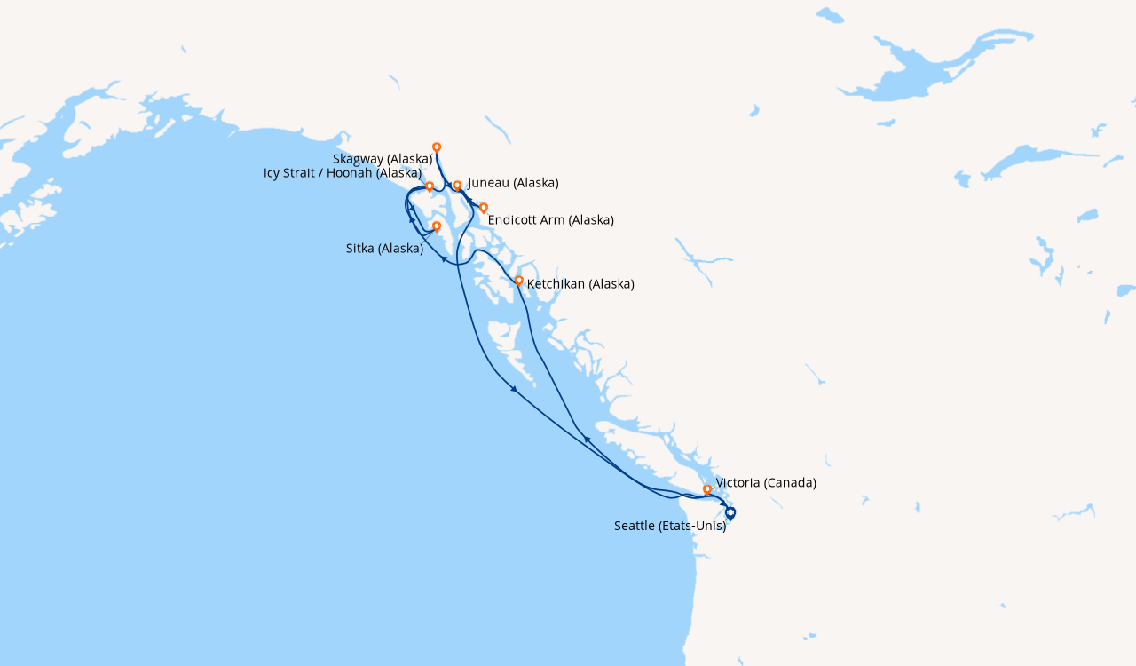 Nous avons embarqué ce mois-ci, mon agent m'a proposé un package vol+croisière depuis Paris alors on a tenté l'experience pour changer de la méditerranée.Et c’est surement le plus grand navire de croisière sur lequel nous ayons navigué.  Les points positifs: de jolies cabines et une configuration de salle de bains assez astucieuse, cela dit les espaces de rangement trop petits, surtout quand on est 2 !.. un détail qui gache la vie à bord: l'ascenseur à l'attente interminable.. côté itinéraire, le escales sont bien choiseies, avec pas trop de journées en mer. Ketchikan, juneau et icy strait (port privé) rasseble tout ce qu'on aime dans le nord de l'amérique: de l'espace, des montagnes, de l'air pur et des gens vraiment sympas, à condition de parler anglais un minimum. voila pour mon avis !