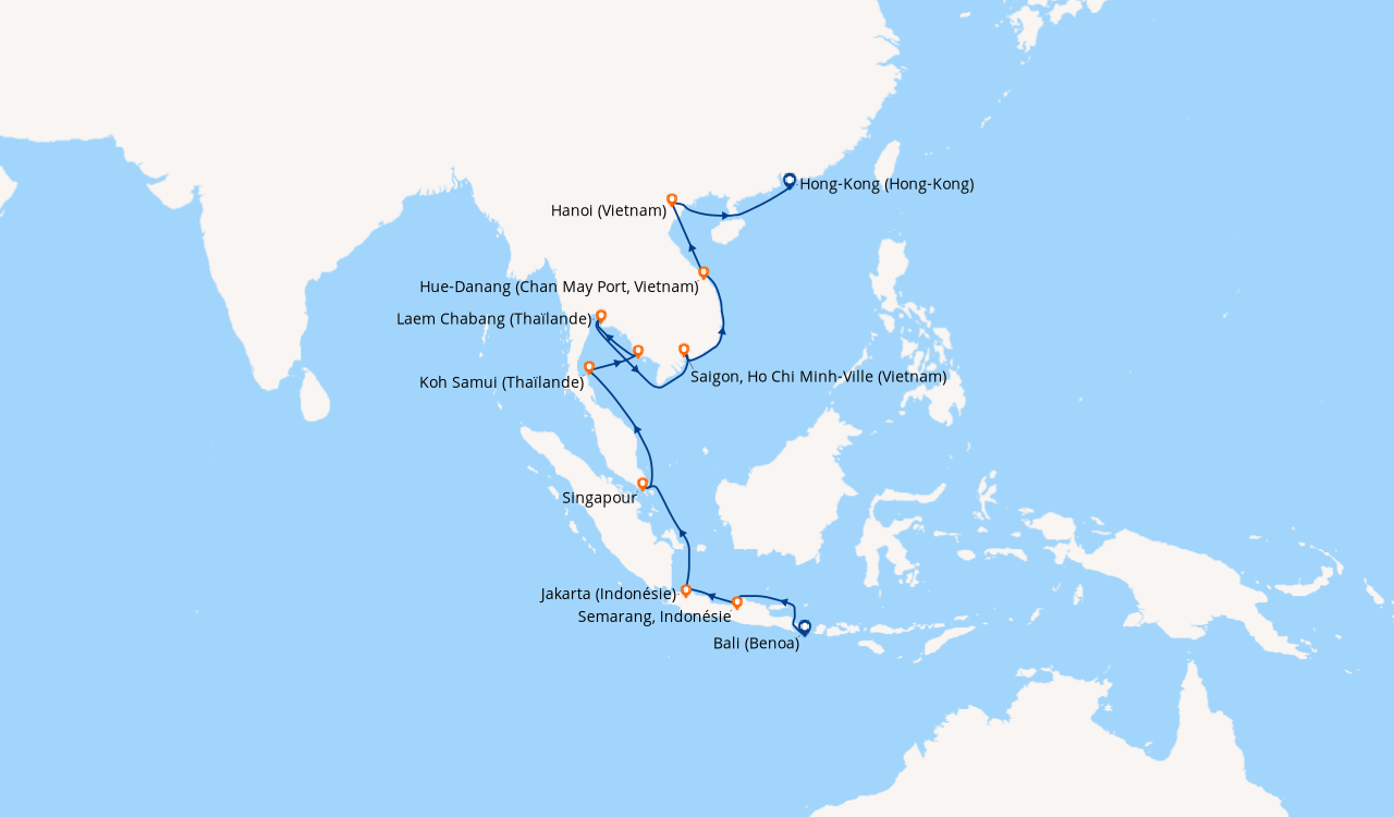 Pour les escales au Vietnam, en Chine et en Indonésie, un visa de transit, dont s'occupent en général les compagnies de croisière, est obligatoire et sera facturé dans le cadre de vos dépenses à bord.