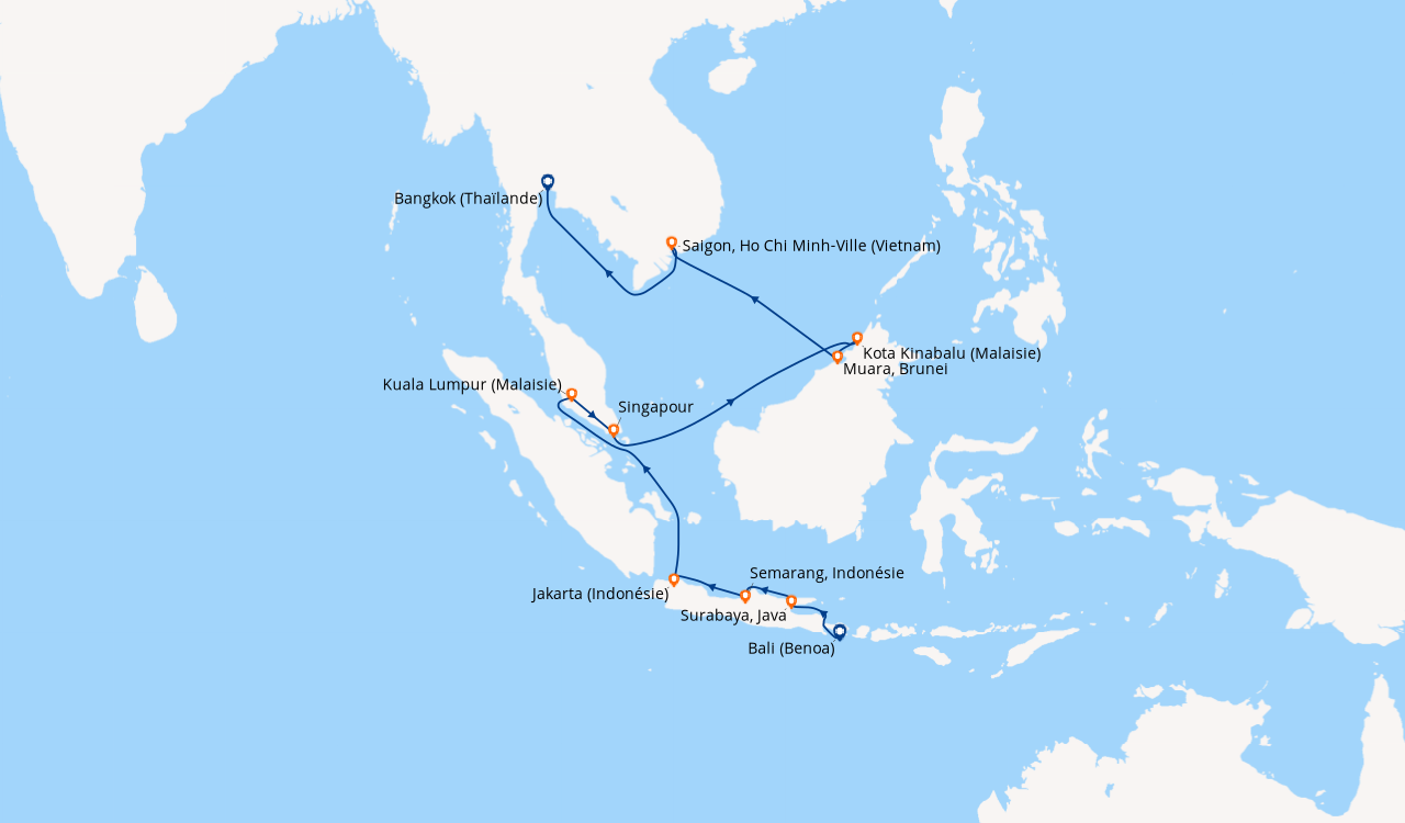 Pour les escales au Vietnam, en Chine et en Indonésie, un visa de transit, dont s'occupent en général les compagnies de croisière, est obligatoire et sera facturé dans le cadre de vos dépenses à bord.