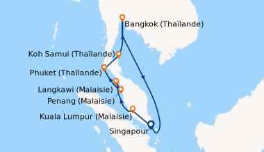 comme on a été très limités au nivau des dates on a choisi un peu par défaut la péninsule malaisienne. Certains des ports étaient vraiment décevants, notamment Phuket, pas terrible. Notre cabine était démodée et avait besoin d'un on coup de frais, la moquette était très usée. Par contre pour la 1ère fois je dois dire que le capitaine doit être applaudi, c’est un homme très attentionné et humain qui n’a cessé de donner de nous tenir informés, nous faire des blagues au micro, parti à notre rencontre deu xfois en une semaine ! hyper dévoué, du jamais vu :)