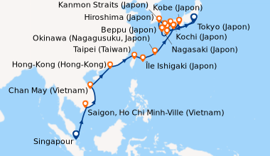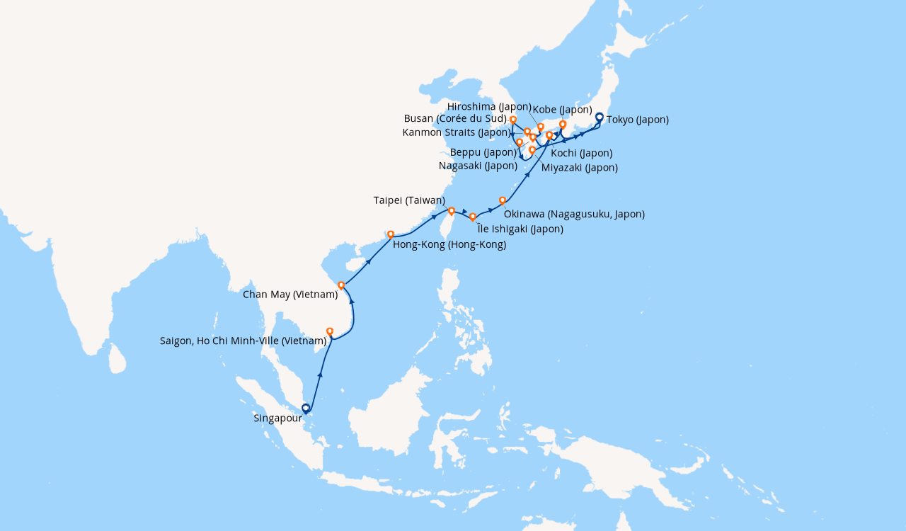 Une taxe locale japonaise (env. 1 000 ¥/passager) peut être appliquée pour les croisières faisant escale au Japon. Elle peut être facturée avant départ ou prélevée à bord selon la compagnie.