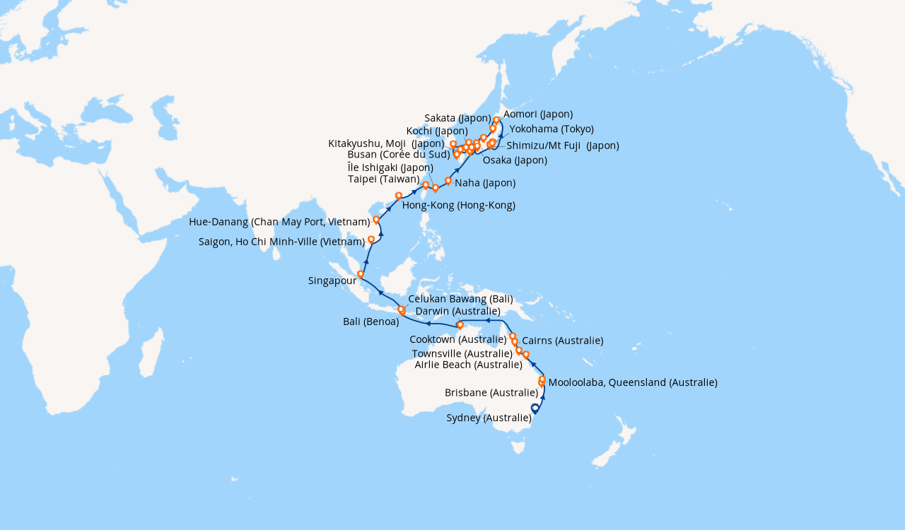 Une taxe locale japonaise (env. 1 000 ¥/passager) peut être appliquée pour les croisières faisant escale au Japon. Elle peut être facturée avant départ ou prélevée à bord selon la compagnie.