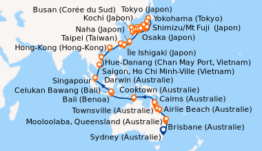 Pour les escales au Vietnam, en Chine et en Indonésie, un visa de transit, dont s'occupent en général les compagnies de croisière, est obligatoire et sera facturé dans le cadre de vos dépenses à bord.