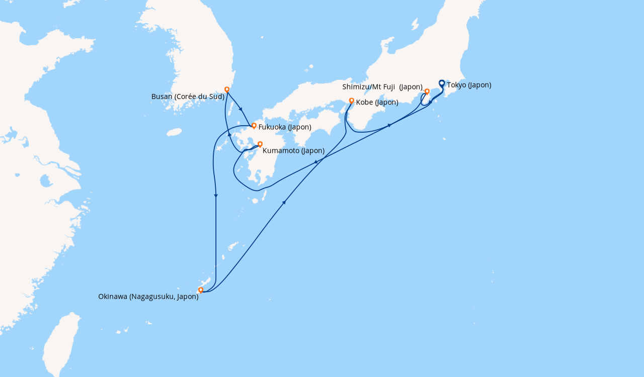 Une taxe locale japonaise (env. 1 000 ¥/passager) peut être appliquée pour les croisières faisant escale au Japon. Elle peut être facturée avant départ ou prélevée à bord selon la compagnie.