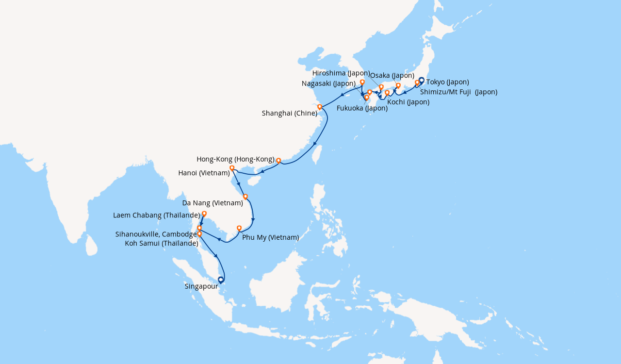 Une taxe locale japonaise (env. 1 000 ¥/passager) peut être appliquée pour les croisières faisant escale au Japon. Elle peut être facturée avant départ ou prélevée à bord selon la compagnie.