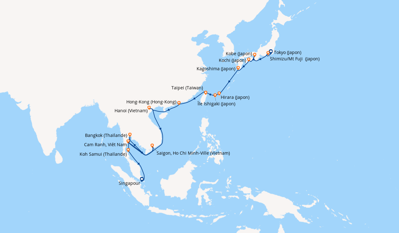 Une taxe locale japonaise (env. 1 000 ¥/passager) peut être appliquée pour les croisières faisant escale au Japon. Elle peut être facturée avant départ ou prélevée à bord selon la compagnie.