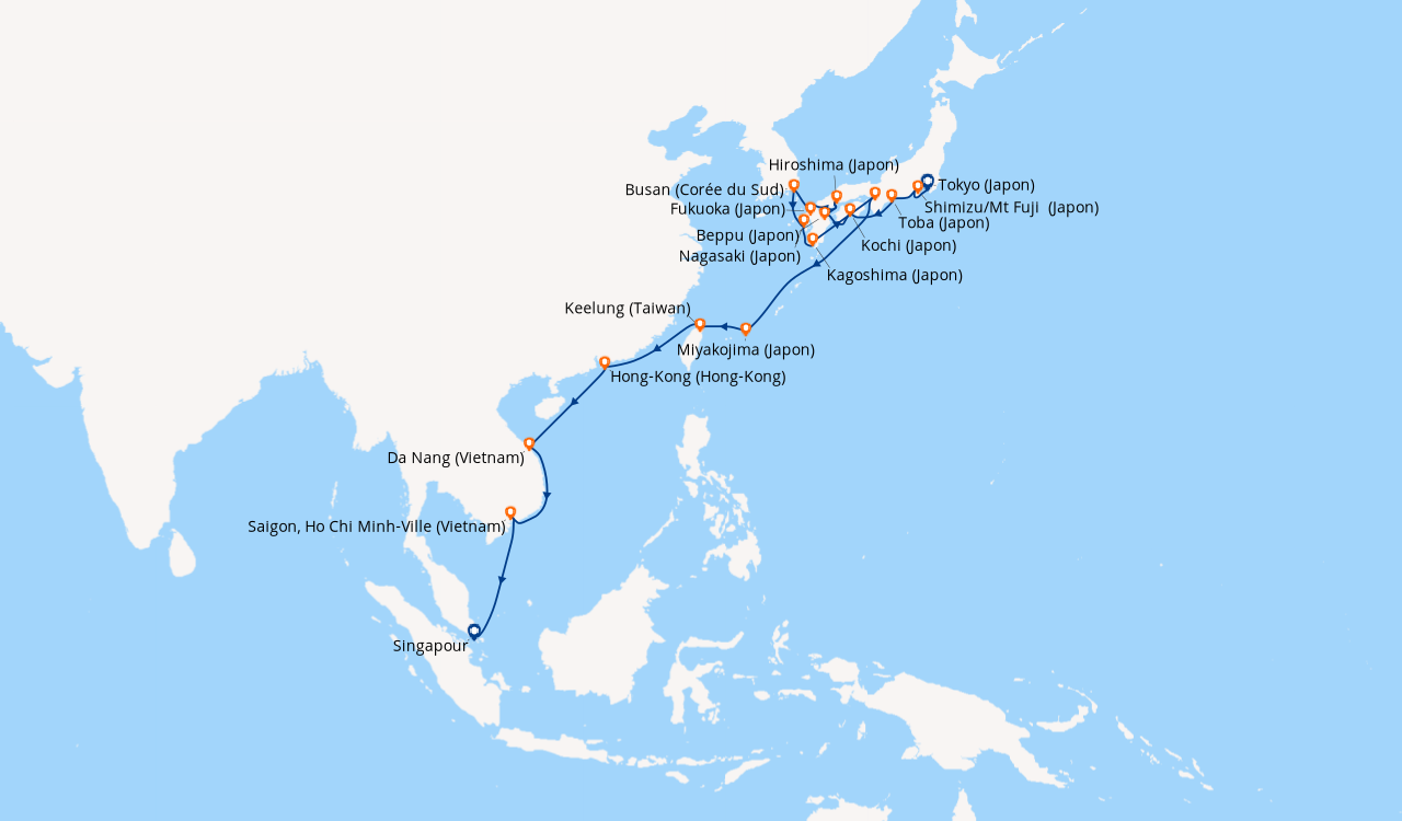 Une taxe locale japonaise (env. 1 000 ¥/passager) peut être appliquée pour les croisières faisant escale au Japon. Elle peut être facturée avant départ ou prélevée à bord selon la compagnie.