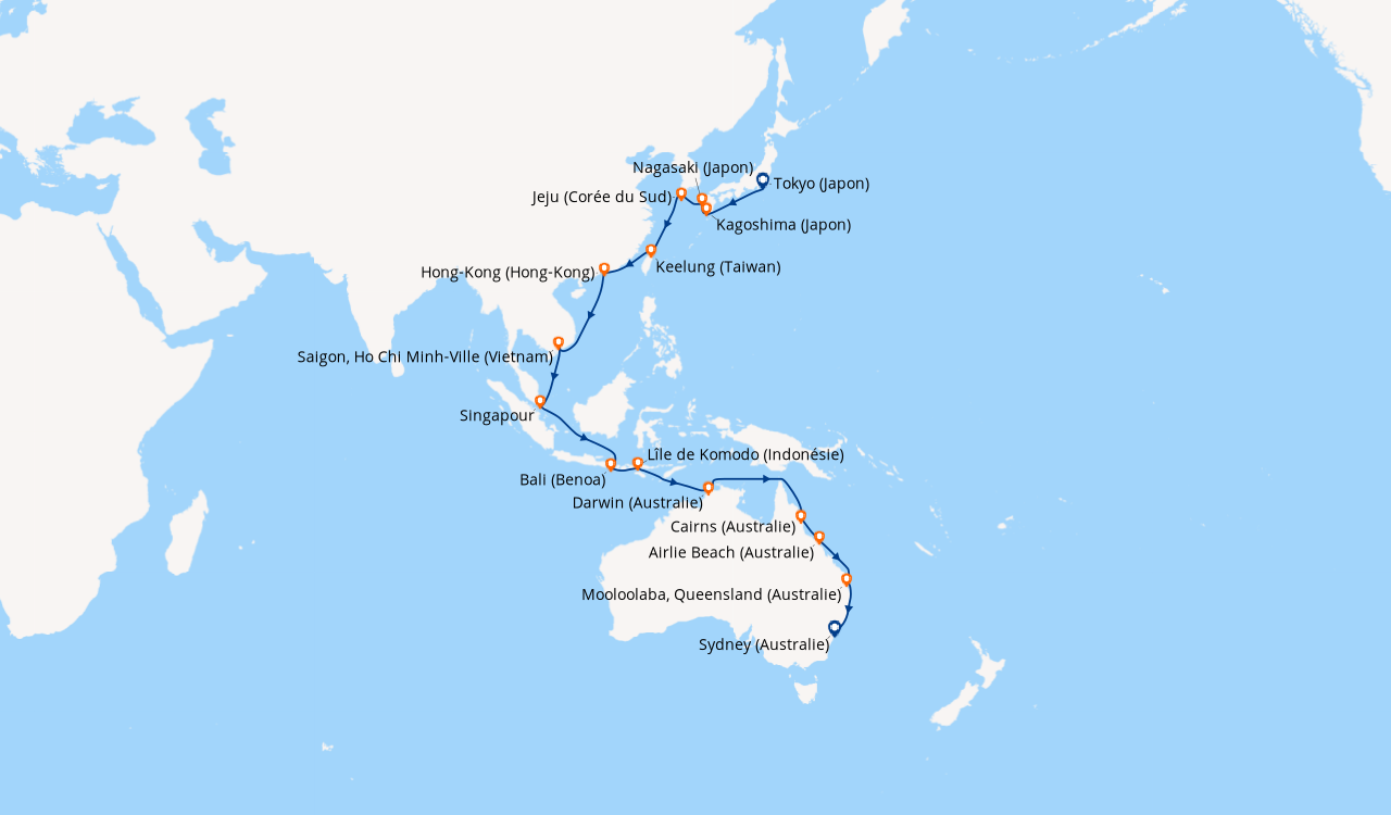 Une taxe locale japonaise (env. 1 000 ¥/passager) peut être appliquée pour les croisières faisant escale au Japon. Elle peut être facturée avant départ ou prélevée à bord selon la compagnie.
