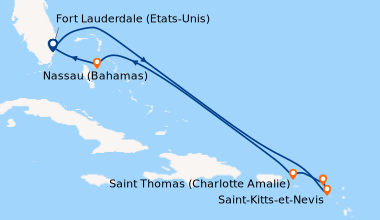 Croisière en Février, à destination des Caraïbe de l’Ouest, embarquement à Fort Lauderdale (Port Everglades) L’embarquement est rapide. Notre cabine balcon sur le pont N°11 du côté droit est parfaitement située pour admirer l’approche des ports aux escales, elle est claire, spacieuse bien agencée, avec une baie vitrée que nous laissions ouverte afin de laisser au lever du soleil, le soin de nous réveiller chaque matin. Le balcon est équipé de deux chaises et une table qui ont servis pour nos petits déjeuners et deux fois pour le déjeuner…