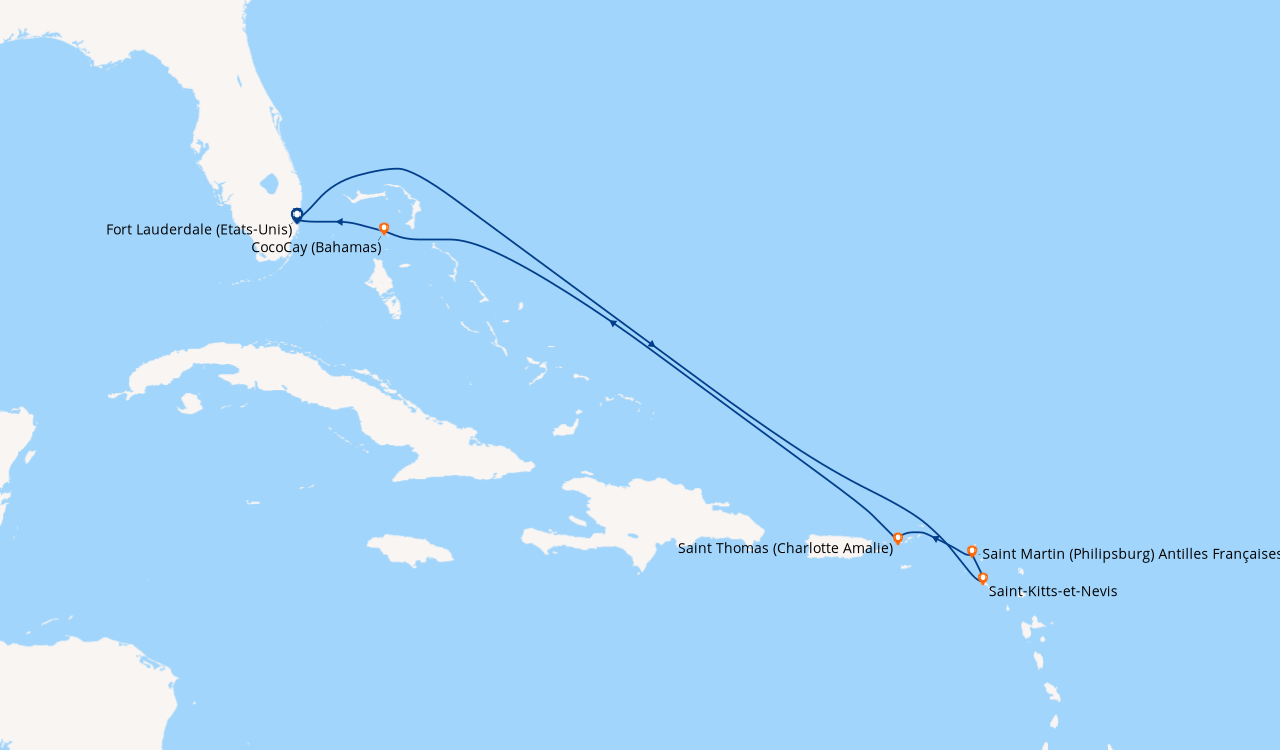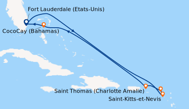 Croisière en Février, à destination des Caraïbe de l’Ouest, embarquement à Fort Lauderdale (Port Everglades) L’embarquement est rapide. Notre cabine balcon sur le pont N°11 du côté droit est parfaitement située pour admirer l’approche des ports aux escales, elle est claire, spacieuse bien agencée, avec une baie vitrée que nous laissions ouverte afin de laisser au lever du soleil, le soin de nous réveiller chaque matin. Le balcon est équipé de deux chaises et une table qui ont servis pour nos petits déjeuners et deux fois pour le déjeuner…