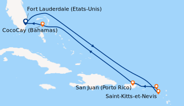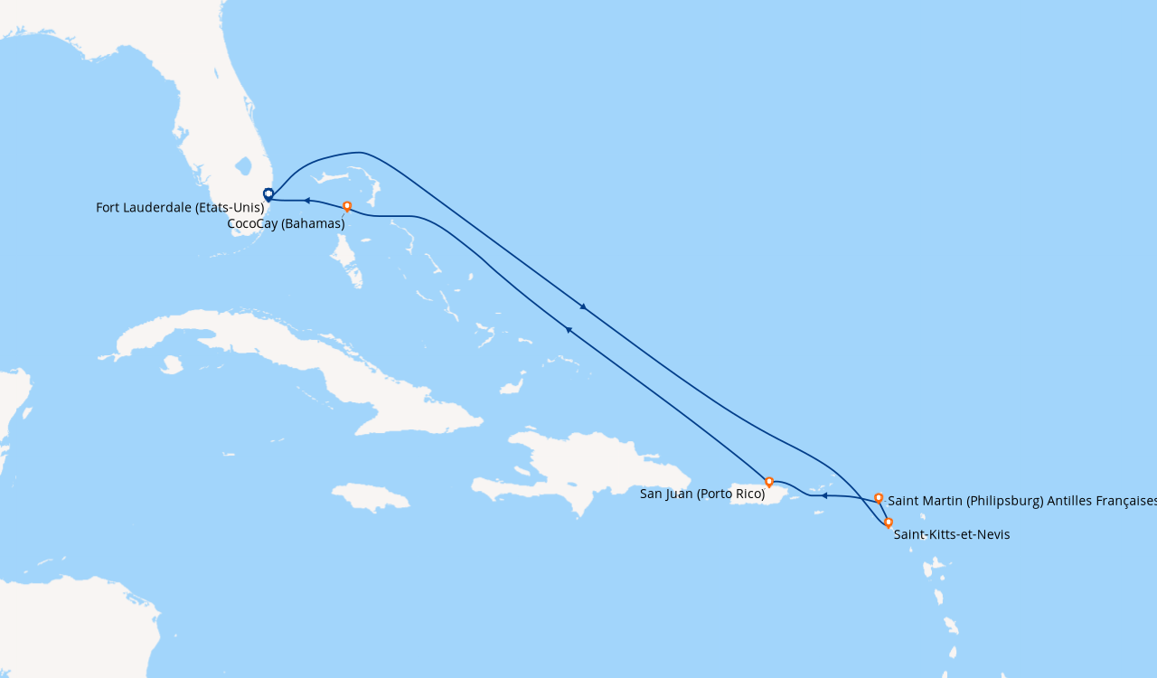 Croisière en Février, à destination des Caraïbe de l’Ouest, embarquement à Fort Lauderdale (Port Everglades) L’embarquement est rapide. Notre cabine balcon sur le pont N°11 du côté droit est parfaitement située pour admirer l’approche des ports aux escales, elle est claire, spacieuse bien agencée, avec une baie vitrée que nous laissions ouverte afin de laisser au lever du soleil, le soin de nous réveiller chaque matin. Le balcon est équipé de deux chaises et une table qui ont servis pour nos petits déjeuners et deux fois pour le déjeuner…