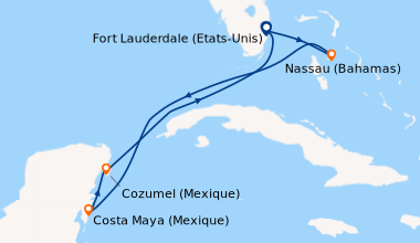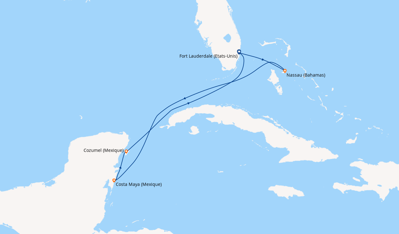 Croisière en Février, à destination des Caraïbe de l’Ouest, embarquement à Fort Lauderdale (Port Everglades) L’embarquement est rapide. Notre cabine balcon sur le pont N°11 du côté droit est parfaitement située pour admirer l’approche des ports aux escales, elle est claire, spacieuse bien agencée, avec une baie vitrée que nous laissions ouverte afin de laisser au lever du soleil, le soin de nous réveiller chaque matin. Le balcon est équipé de deux chaises et une table qui ont servis pour nos petits déjeuners et deux fois pour le déjeuner…