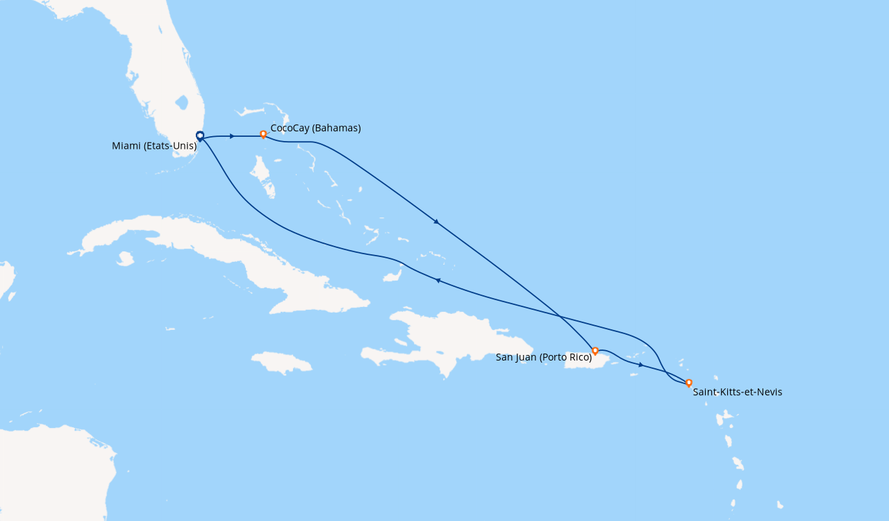 Croisière en Février, à destination des Caraïbe de l’Ouest, embarquement à Fort Lauderdale (Port Everglades) L’embarquement est rapide. Notre cabine balcon sur le pont N°11 du côté droit est parfaitement située pour admirer l’approche des ports aux escales, elle est claire, spacieuse bien agencée, avec une baie vitrée que nous laissions ouverte afin de laisser au lever du soleil, le soin de nous réveiller chaque matin. Le balcon est équipé de deux chaises et une table qui ont servis pour nos petits déjeuners et deux fois pour le déjeuner…