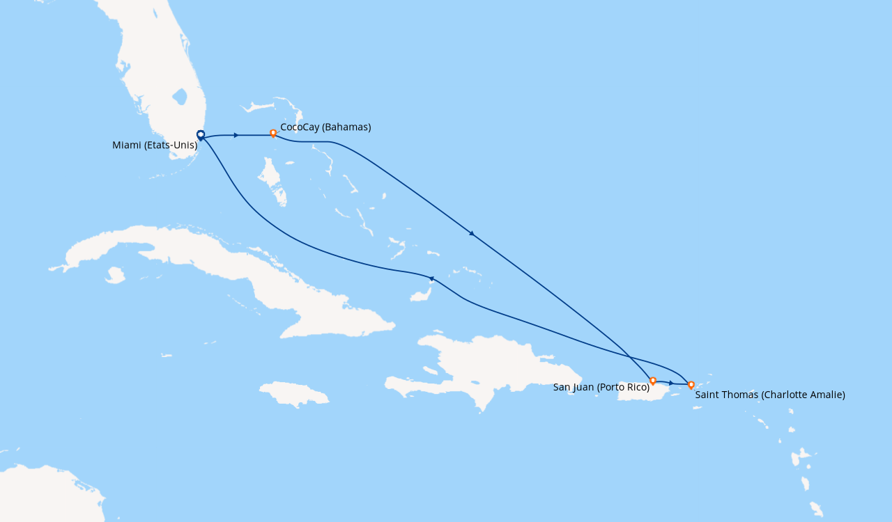 Croisière en Février, à destination des Caraïbe de l’Ouest, embarquement à Fort Lauderdale (Port Everglades) L’embarquement est rapide. Notre cabine balcon sur le pont N°11 du côté droit est parfaitement située pour admirer l’approche des ports aux escales, elle est claire, spacieuse bien agencée, avec une baie vitrée que nous laissions ouverte afin de laisser au lever du soleil, le soin de nous réveiller chaque matin. Le balcon est équipé de deux chaises et une table qui ont servis pour nos petits déjeuners et deux fois pour le déjeuner…