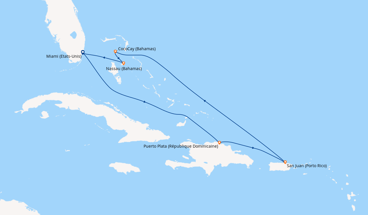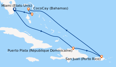 Croisière en Février, à destination des Caraïbe de l’Ouest, embarquement à Fort Lauderdale (Port Everglades) L’embarquement est rapide. Notre cabine balcon sur le pont N°11 du côté droit est parfaitement située pour admirer l’approche des ports aux escales, elle est claire, spacieuse bien agencée, avec une baie vitrée que nous laissions ouverte afin de laisser au lever du soleil, le soin de nous réveiller chaque matin. Le balcon est équipé de deux chaises et une table qui ont servis pour nos petits déjeuners et deux fois pour le déjeuner…