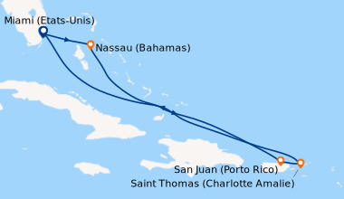 En Janvier de Fort Lauderdale (Port Everglades) aux Caraïbes orientales. Nous faisons de nombreuses croisières chaque année. A l’occasion de notre 45e anniversaire de mariage nous avons choisi de nous offrir une suite junior pour changer. La cabine junior N° 9548 est bien située car pas trop éloignée des ascenseurs, très calme bien que située à l’avant. Durant le séjour, nous prenons nos déjeuners dans le windjammer qui propose une cuisine correcte, variée, mais pour dîner nous préférons la salle à manger. Installés sur le pont 4 avec 4 autres convives avec qui nous avons sympathisé, nous bénéficions d’un service très professionnel, d’une cuisine qui nous satisfait amplement car nous trouvons toujours quelque chose à notre goût sur le menu. Nous n’avons pas assisté aux spectacles car déjà vu auparavant. J’aime déambuler dans La Royal promenade, elle est très propre, comme l’ensemble du navire, très animée, bien décorée, avec de belles boutiques, bars restaurants, dont mon préféré est le Café Promenade. De sa terrasse, on peut voir défiler les passagers, en se régalant d’une de leurs succulentes pâtisseries. Si Saint-Kitts et Nevis sont dans vos projets de visites, je vous conseille vivement de former un groupe et d’aller avec Island Excursions Grey pour un divertissant et instructif tour de l’île. Ils viennent vous chercher au navire, après la visite on peut se poser plusieurs heures à Reggae Beach. Cette visite est mieux, moins chère que celle proposée par RCI. Je souhaite à tous une mer calme et une agréable croisière.