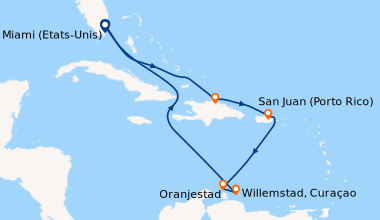 En Janvier de Fort Lauderdale (Port Everglades) aux Caraïbes orientales. Nous faisons de nombreuses croisières chaque année. A l’occasion de notre 45e anniversaire de mariage nous avons choisi de nous offrir une suite junior pour changer. La cabine junior N° 9548 est bien située car pas trop éloignée des ascenseurs, très calme bien que située à l’avant. Durant le séjour, nous prenons nos déjeuners dans le windjammer qui propose une cuisine correcte, variée, mais pour dîner nous préférons la salle à manger. Installés sur le pont 4 avec 4 autres convives avec qui nous avons sympathisé, nous bénéficions d’un service très professionnel, d’une cuisine qui nous satisfait amplement car nous trouvons toujours quelque chose à notre goût sur le menu. Nous n’avons pas assisté aux spectacles car déjà vu auparavant. J’aime déambuler dans La Royal promenade, elle est très propre, comme l’ensemble du navire, très animée, bien décorée, avec de belles boutiques, bars restaurants, dont mon préféré est le Café Promenade. De sa terrasse, on peut voir défiler les passagers, en se régalant d’une de leurs succulentes pâtisseries. Si Saint-Kitts et Nevis sont dans vos projets de visites, je vous conseille vivement de former un groupe et d’aller avec Island Excursions Grey pour un divertissant et instructif tour de l’île. Ils viennent vous chercher au navire, après la visite on peut se poser plusieurs heures à Reggae Beach. Cette visite est mieux, moins chère que celle proposée par RCI. Je souhaite à tous une mer calme et une agréable croisière.