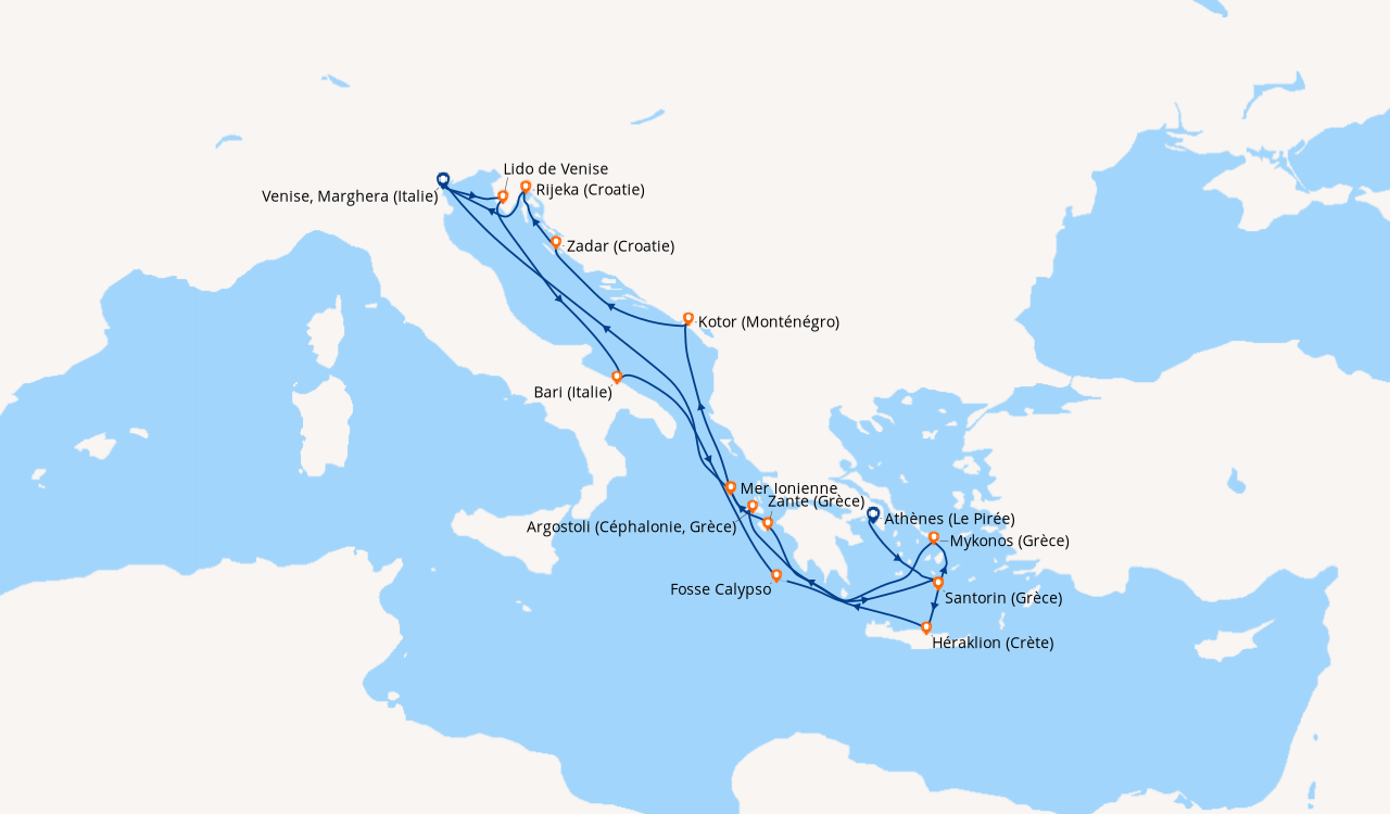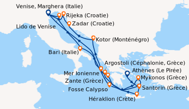 A la découverte des îles grecques en avril. Aucune place pour l’ennui, car les animateurs s’organisent pour divertir toutes les classes d’âges: cours de cuisine jeux, danse, aérobic, …. Avec une escales par jour, il y a la possibilité de s’inscrire à différentes excursions (payantes), ce n’est pas donné (à 5 ça chiffre vite), nous avons préféré faire des visites libres. Venise la romantique, nous attendait avec ses palais, églises, ponts, canaux et son joyau, la Basilique Saint Marc; En Italie, Bari cernés de remparts antiques, ressemble à une capitale historique baignée par la mer adriatique; En Grèce, Corfou, bordée par les plages de sables blancs, les aux turquoises de la mer ionienne; Santorin, (ma préférée), étonnante île volcanique au sable noir avec son point de vue culminant qui permet d’admirer les îles voisines; Athènes avec son Acropole et sa ville haute fortifiée; En Croatie, Dubrovnik, où chaque chemin mène vers un chef-d’œuvre d’architecture : églises, fontaines, palais et monastères cernés de remparts dont la visite est incontournable. Que de merveilleux souvenirs ! Mathide