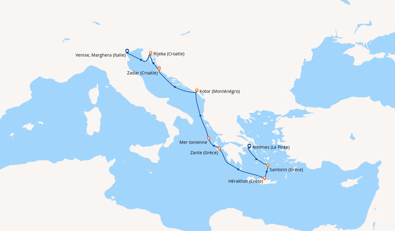 A la découverte des îles grecques en avril. Aucune place pour l’ennui, car les animateurs s’organisent pour divertir toutes les classes d’âges: cours de cuisine jeux, danse, aérobic, …. Avec une escales par jour, il y a la possibilité de s’inscrire à différentes excursions (payantes), ce n’est pas donné (à 5 ça chiffre vite), nous avons préféré faire des visites libres. Venise la romantique, nous attendait avec ses palais, églises, ponts, canaux et son joyau, la Basilique Saint Marc; En Italie, Bari cernés de remparts antiques, ressemble à une capitale historique baignée par la mer adriatique; En Grèce, Corfou, bordée par les plages de sables blancs, les aux turquoises de la mer ionienne; Santorin, (ma préférée), étonnante île volcanique au sable noir avec son point de vue culminant qui permet d’admirer les îles voisines; Athènes avec son Acropole et sa ville haute fortifiée; En Croatie, Dubrovnik, où chaque chemin mène vers un chef-d’œuvre d’architecture : églises, fontaines, palais et monastères cernés de remparts dont la visite est incontournable. Que de merveilleux souvenirs ! Mathide