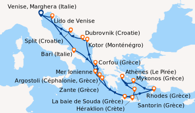 A la découverte des îles grecques en avril. Aucune place pour l’ennui, car les animateurs s’organisent pour divertir toutes les classes d’âges: cours de cuisine jeux, danse, aérobic, …. Avec une escales par jour, il y a la possibilité de s’inscrire à différentes excursions (payantes), ce n’est pas donné (à 5 ça chiffre vite), nous avons préféré faire des visites libres. Venise la romantique, nous attendait avec ses palais, églises, ponts, canaux et son joyau, la Basilique Saint Marc; En Italie, Bari cernés de remparts antiques, ressemble à une capitale historique baignée par la mer adriatique; En Grèce, Corfou, bordée par les plages de sables blancs, les aux turquoises de la mer ionienne; Santorin, (ma préférée), étonnante île volcanique au sable noir avec son point de vue culminant qui permet d’admirer les îles voisines; Athènes avec son Acropole et sa ville haute fortifiée; En Croatie, Dubrovnik, où chaque chemin mène vers un chef-d’œuvre d’architecture : églises, fontaines, palais et monastères cernés de remparts dont la visite est incontournable. Que de merveilleux souvenirs ! Mathide