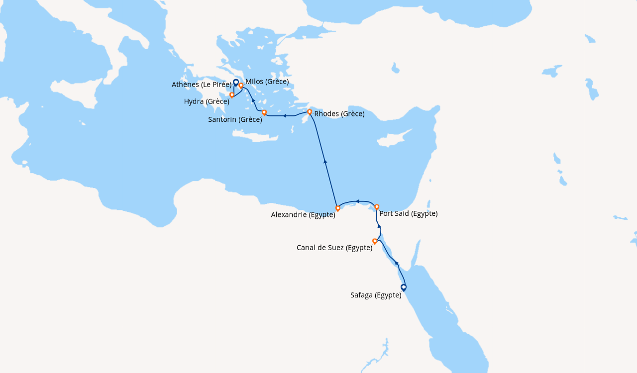 Si embarquement en Egypte, et si les hôtes ne sont pas en mesure de se procurer le visa à entrées multiples en ligne avant le départ, ils peuvent acquérir la première vignette de visa d'entrée directement à l'aéroport d'Hurghada dans les bureaux du gouvernement, en payant l'équivalent de USD 25,00. La deuxième vignette de visa d'entrée requise à la fin de la croisière, lorsque le navire retourne en Égypte, doit être achetée directement à bord au prix de 29 euros. Cette solution alternative n'est pas valable pour les nationalités nécessitant un visa pré-émis par une ambassade ou un consulat.
