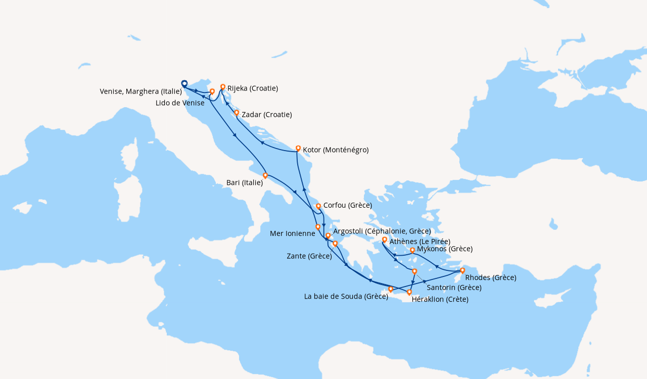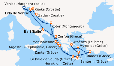 A la découverte des îles grecques en avril. Aucune place pour l’ennui, car les animateurs s’organisent pour divertir toutes les classes d’âges: cours de cuisine jeux, danse, aérobic, …. Avec une escales par jour, il y a la possibilité de s’inscrire à différentes excursions (payantes), ce n’est pas donné (à 5 ça chiffre vite), nous avons préféré faire des visites libres. Venise la romantique, nous attendait avec ses palais, églises, ponts, canaux et son joyau, la Basilique Saint Marc; En Italie, Bari cernés de remparts antiques, ressemble à une capitale historique baignée par la mer adriatique; En Grèce, Corfou, bordée par les plages de sables blancs, les aux turquoises de la mer ionienne; Santorin, (ma préférée), étonnante île volcanique au sable noir avec son point de vue culminant qui permet d’admirer les îles voisines; Athènes avec son Acropole et sa ville haute fortifiée; En Croatie, Dubrovnik, où chaque chemin mène vers un chef-d’œuvre d’architecture : églises, fontaines, palais et monastères cernés de remparts dont la visite est incontournable. Que de merveilleux souvenirs ! Mathide