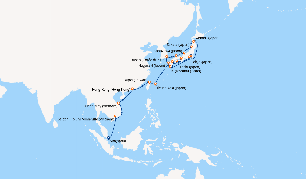 Une taxe locale japonaise (env. 1 000 ¥/passager) peut être appliquée pour les croisières faisant escale au Japon. Elle peut être facturée avant départ ou prélevée à bord selon la compagnie.