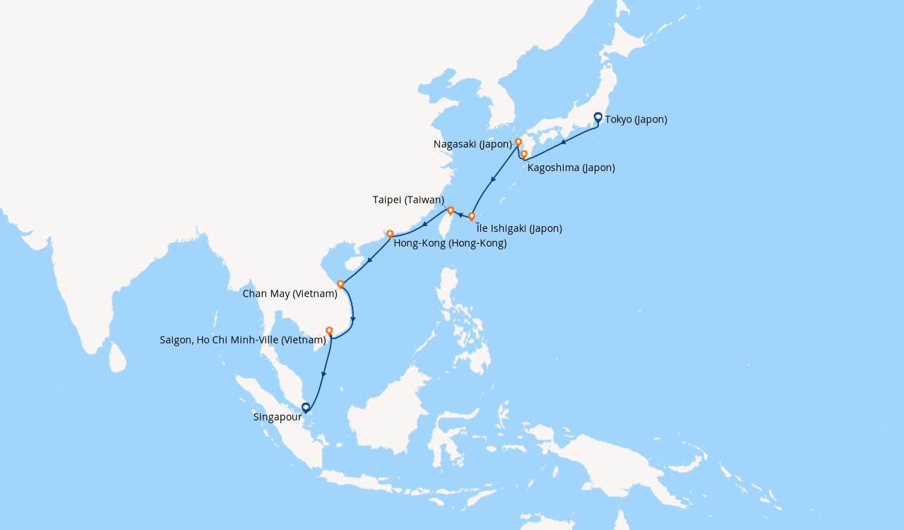 Une taxe locale japonaise (env. 1 000 ¥/passager) peut être appliquée pour les croisières faisant escale au Japon. Elle peut être facturée avant départ ou prélevée à bord selon la compagnie.