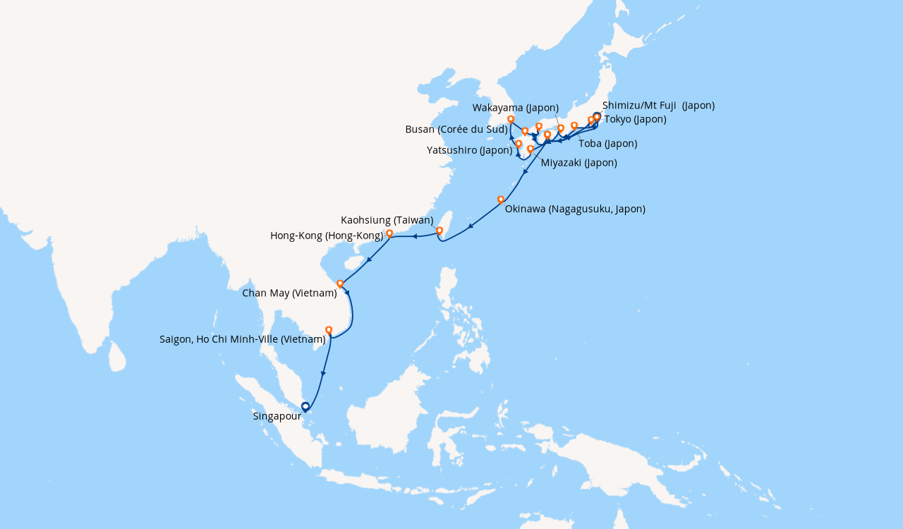 Une taxe locale japonaise (env. 1 000 ¥/passager) peut être appliquée pour les croisières faisant escale au Japon. Elle peut être facturée avant départ ou prélevée à bord selon la compagnie.