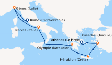 Croisière en avril’ à destination de la Méditerranée, embarquement à Marseille C’est notre première croisière avec ma femme et mes deux enfants. Avant de partir, j’ai lu des bonnes et moins bonnes critiques sur le navire, mais après notre croisière je peux affirmer que le bateau est superbe, les équipements excellents, les animations sympas, la restauration variée, le personnel chaleureux et amical. L’embarquement est rapide, sans faille. La chambre (avec balcon) est spacieuse, claire, luxueuse, avec de grands lits confortables. Nous avons pris le forfait boissons ‘tout compris’ : 480 € pour 4 personnes/ la semaine ; Il est très économique car il comprend tous les cocktails, spiritueux, vins et bières, les eaux, crèmes glacées, etc. Si vous ne choisissez pas cette option, il faut savoir que les prix sont un peu chers : cocktail 8€, pour une bouteille de bière 5,50€, pour une crème glacée 5 €. Nous avons choisi MSC croisieres parce que les enfants de moins de 12 ans voyagent gratuitement (sauf taxes portuaires bar etc.) Sans aucun frais cachés. Cela signifie, un prix abordable pour une famille de quatre personnes. Les enfants adore l’ambiance du navire, les liens d’amitiés noués avec les passagers de leur âge et les équipements : les piscines, les clubs, etc….. La croisière réunie de nombreuses familles avec enfants, des couples, des groupes, et de nombreuses nationalités dont la moyenne d’âge est assez jeune. Cette croisière sous le signe de la découverte, l’amitié, la joie de vivre, nous donne la certitude qu’il ne faut pas attendre trop longtemps pour y retourner.