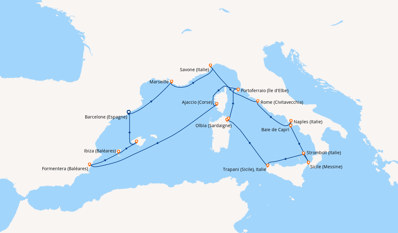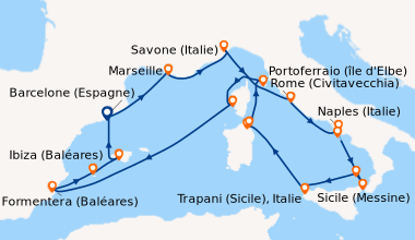 La mediterranée en juillet de barcelone Nous avons choisi Costa en raison de son prix abordable et de sa destination ensoleillée. L’embarquement à Barcelone se fait en un temps record (15 minutes). La cabine extérieure que nous avons choisie est grande et bien aménagée. Nous étions quatre, alors par économie, nous avons opté pour le forfait boissons, au final, nous avons bien fait.Le navire est spacieux et sa décoration moderne. Si vous souhaitez du homard, ne cherchez pas, Costa n’offre pas une restauration gastronomique, mais c’est acceptable, le service est rapide, efficace. Nous avons diné au MDR tous les soirs et au buffet sur les ponts 9/10 le reste du temps. Au niveau de l'animation, les spectacles sont de bons niveaux au theatre. Pour de moments de detente, il y a de confortables fauteuils au piano bar avec de la douce musique d’ambiance.Nous avons fait une excursion avec la compagnie mais nous l’avons trouvée chère. Quelques passagers nous ont confié qu'ils avaient fait des économies en prenant leurs excursions à terre. Cette croisière est recommandée pour les familles à tous points de vue