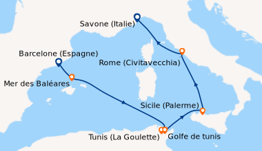 Pour notre 1 ère croisière nous avons passé une semaine extraordinaire a refaire sans problème. Le petit bémol est que pour notre croisière pour l escale au Vatican nous n avons pas pu le visiter car tout était fermé cause arrivée du Pape. Et toute les explications sur le bateau le français était très très rare donc pas évident de savoir se qu ils y avait sur le bateau