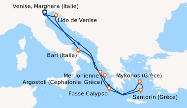 A la découverte des îles grecques en avril. Aucune place pour l’ennui, car les animateurs s’organisent pour divertir toutes les classes d’âges: cours de cuisine jeux, danse, aérobic, …. Avec une escales par jour, il y a la possibilité de s’inscrire à différentes excursions (payantes), ce n’est pas donné (à 5 ça chiffre vite), nous avons préféré faire des visites libres. Venise la romantique, nous attendait avec ses palais, églises, ponts, canaux et son joyau, la Basilique Saint Marc; En Italie, Bari cernés de remparts antiques, ressemble à une capitale historique baignée par la mer adriatique; En Grèce, Corfou, bordée par les plages de sables blancs, les aux turquoises de la mer ionienne; Santorin, (ma préférée), étonnante île volcanique au sable noir avec son point de vue culminant qui permet d’admirer les îles voisines; Athènes avec son Acropole et sa ville haute fortifiée; En Croatie, Dubrovnik, où chaque chemin mène vers un chef-d’œuvre d’architecture : églises, fontaines, palais et monastères cernés de remparts dont la visite est incontournable. Que de merveilleux souvenirs ! Mathide