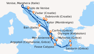 A la découverte des îles grecques en avril. Aucune place pour l’ennui, car les animateurs s’organisent pour divertir toutes les classes d’âges: cours de cuisine jeux, danse, aérobic, …. Avec une escales par jour, il y a la possibilité de s’inscrire à différentes excursions (payantes), ce n’est pas donné (à 5 ça chiffre vite), nous avons préféré faire des visites libres. Venise la romantique, nous attendait avec ses palais, églises, ponts, canaux et son joyau, la Basilique Saint Marc; En Italie, Bari cernés de remparts antiques, ressemble à une capitale historique baignée par la mer adriatique; En Grèce, Corfou, bordée par les plages de sables blancs, les aux turquoises de la mer ionienne; Santorin, (ma préférée), étonnante île volcanique au sable noir avec son point de vue culminant qui permet d’admirer les îles voisines; Athènes avec son Acropole et sa ville haute fortifiée; En Croatie, Dubrovnik, où chaque chemin mène vers un chef-d’œuvre d’architecture : églises, fontaines, palais et monastères cernés de remparts dont la visite est incontournable. Que de merveilleux souvenirs ! Mathide