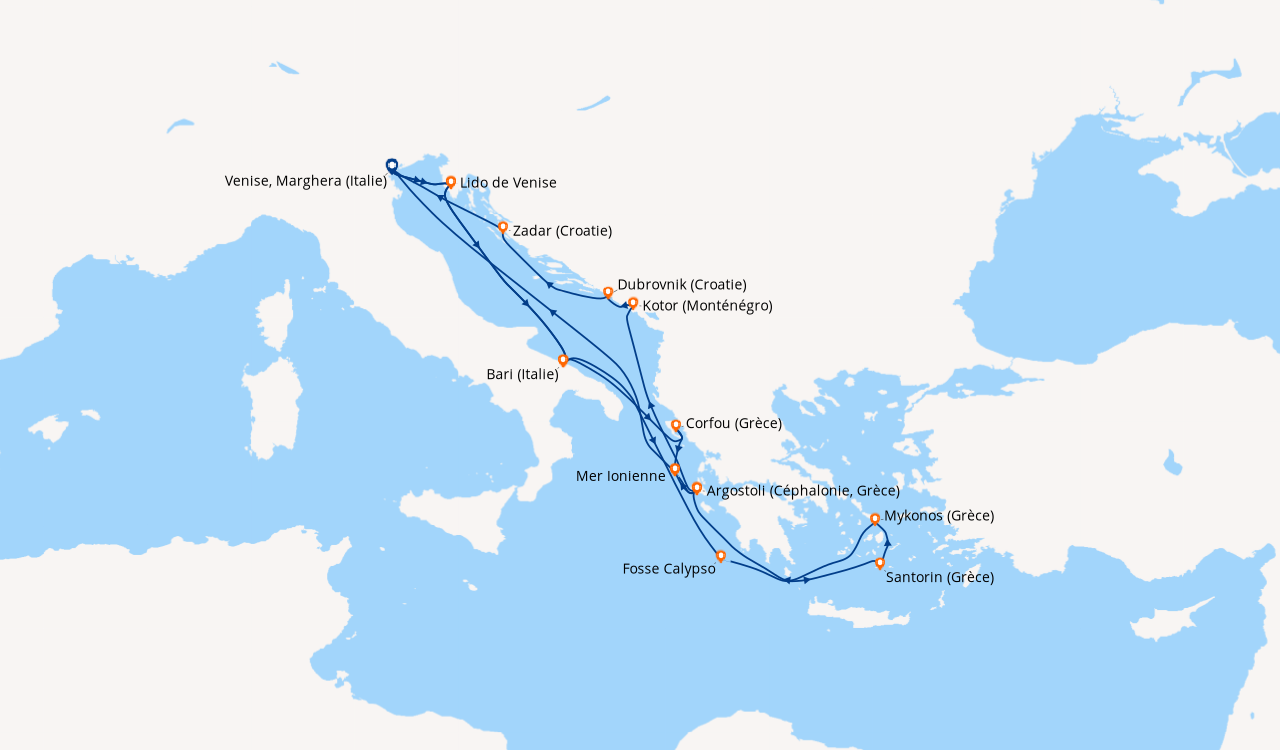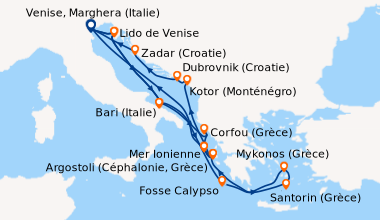 A la découverte des îles grecques en avril. Aucune place pour l’ennui, car les animateurs s’organisent pour divertir toutes les classes d’âges: cours de cuisine jeux, danse, aérobic, …. Avec une escales par jour, il y a la possibilité de s’inscrire à différentes excursions (payantes), ce n’est pas donné (à 5 ça chiffre vite), nous avons préféré faire des visites libres. Venise la romantique, nous attendait avec ses palais, églises, ponts, canaux et son joyau, la Basilique Saint Marc; En Italie, Bari cernés de remparts antiques, ressemble à une capitale historique baignée par la mer adriatique; En Grèce, Corfou, bordée par les plages de sables blancs, les aux turquoises de la mer ionienne; Santorin, (ma préférée), étonnante île volcanique au sable noir avec son point de vue culminant qui permet d’admirer les îles voisines; Athènes avec son Acropole et sa ville haute fortifiée; En Croatie, Dubrovnik, où chaque chemin mène vers un chef-d’œuvre d’architecture : églises, fontaines, palais et monastères cernés de remparts dont la visite est incontournable. Que de merveilleux souvenirs ! Mathide