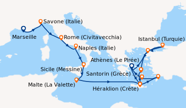 Septembre aux couleurs de la Méditerranée, au départ de Savone (Italie). Les excursions sont intéressantes, car l’itinéraire permet de faire escale dans 4 pays différents de la Méditerranée (Grèce, Israël, Turquie et Italie) avec assez de temps pour faire une visite approfondie, sur la journée, mais elles sont bien trop chères. Nous les avons tout de même achetées pour ne pas être inquiétés par les imprévus. Belle ballade en bleue !