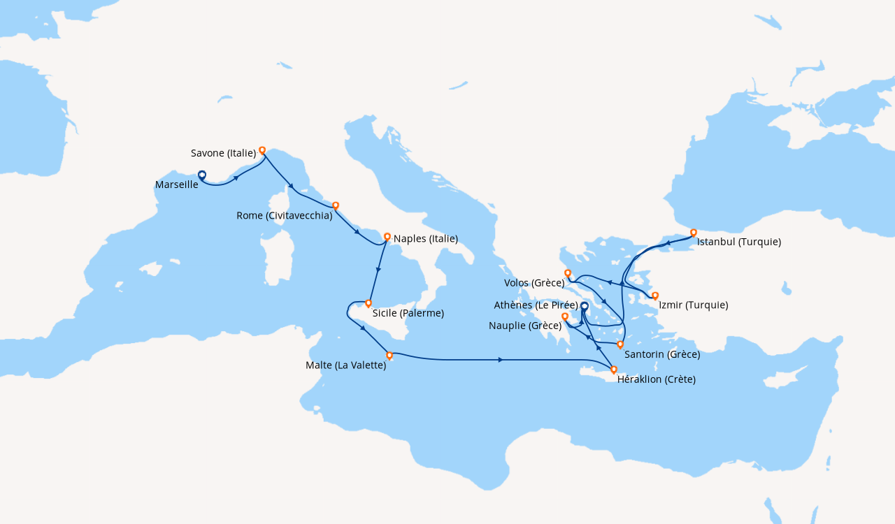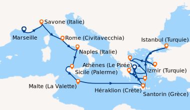Septembre aux couleurs de la Méditerranée, au départ de Savone (Italie). Les excursions sont intéressantes, car l’itinéraire permet de faire escale dans 4 pays différents de la Méditerranée (Grèce, Israël, Turquie et Italie) avec assez de temps pour faire une visite approfondie, sur la journée, mais elles sont bien trop chères. Nous les avons tout de même achetées pour ne pas être inquiétés par les imprévus. Belle ballade en bleue !