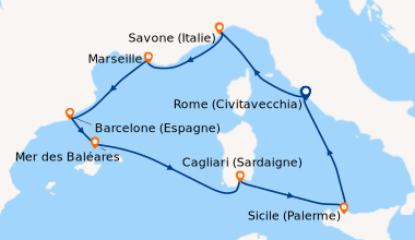Pour notre 1 ère croisière nous avons passé une semaine extraordinaire a refaire sans problème. Le petit bémol est que pour notre croisière pour l escale au Vatican nous n avons pas pu le visiter car tout était fermé cause arrivée du Pape. Et toute les explications sur le bateau le français était très très rare donc pas évident de savoir se qu ils y avait sur le bateau