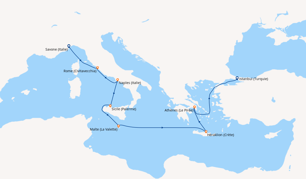 La med en Septembre au depart de Savone. Nous avons réservé cette croisière à la dernière minute pour fêter notre 48e anniversaire de mariage. Nous avons testé d’autres compagnies, mais c’est la première fois avec Costa. Pour l’occasion, nous avons choisi une cabine avec balcon située sur le pont N°11. À notre arrivée, les employés de la compagnie se chargent de nos bagages et garent notre véhicule. Après 40 minutes un personnel courtois et serviable, nous accueillent dans l’immense atrium puis nous rejoignons notre cabine par un des ascenseurs panoramiques. Nous avons pris un forfait boissons ‘tout compris’ qui nous a permis de consommer des boissons de toutes sortes. Il y a un grand choix de menus d’une qualité irréprochable servis par un personnel digne des plus grands établissements. Au théâtre Stardust, des chanteurs et danseurs exécutent des spectacles de première classe, sublimés par l’éclairage et le son dernière génération. De la pop au classique, il y en a pour tous les goûts, dans les lieux dédiés à la musique. Le salon de beauté, salon de coiffure et le spa sont tous à un prix raisonnable avec un personnel amical et serviable. Le service clients est réactif : Nous avons appelé pour un problème en cabine, quelques minutes après c’était réglé et un appel a suivi pour s’assurer que tout était OK. Si je ne devais retenir qu’une chose de cette croisière, outre les magnifiques paysages et le bateau tout confort, c’est l’extrême gentillesse de toutes les personnes qui travaillent à bord. Notre prochaine croisière sera certainement avec Costa.