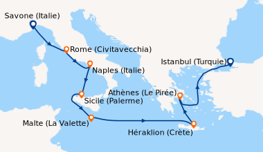 Septembre aux couleurs de la Méditerranée, au départ de Savone (Italie). Les excursions sont intéressantes, car l’itinéraire permet de faire escale dans 4 pays différents de la Méditerranée (Grèce, Israël, Turquie et Italie) avec assez de temps pour faire une visite approfondie, sur la journée, mais elles sont bien trop chères. Nous les avons tout de même achetées pour ne pas être inquiétés par les imprévus. Belle ballade en bleue !