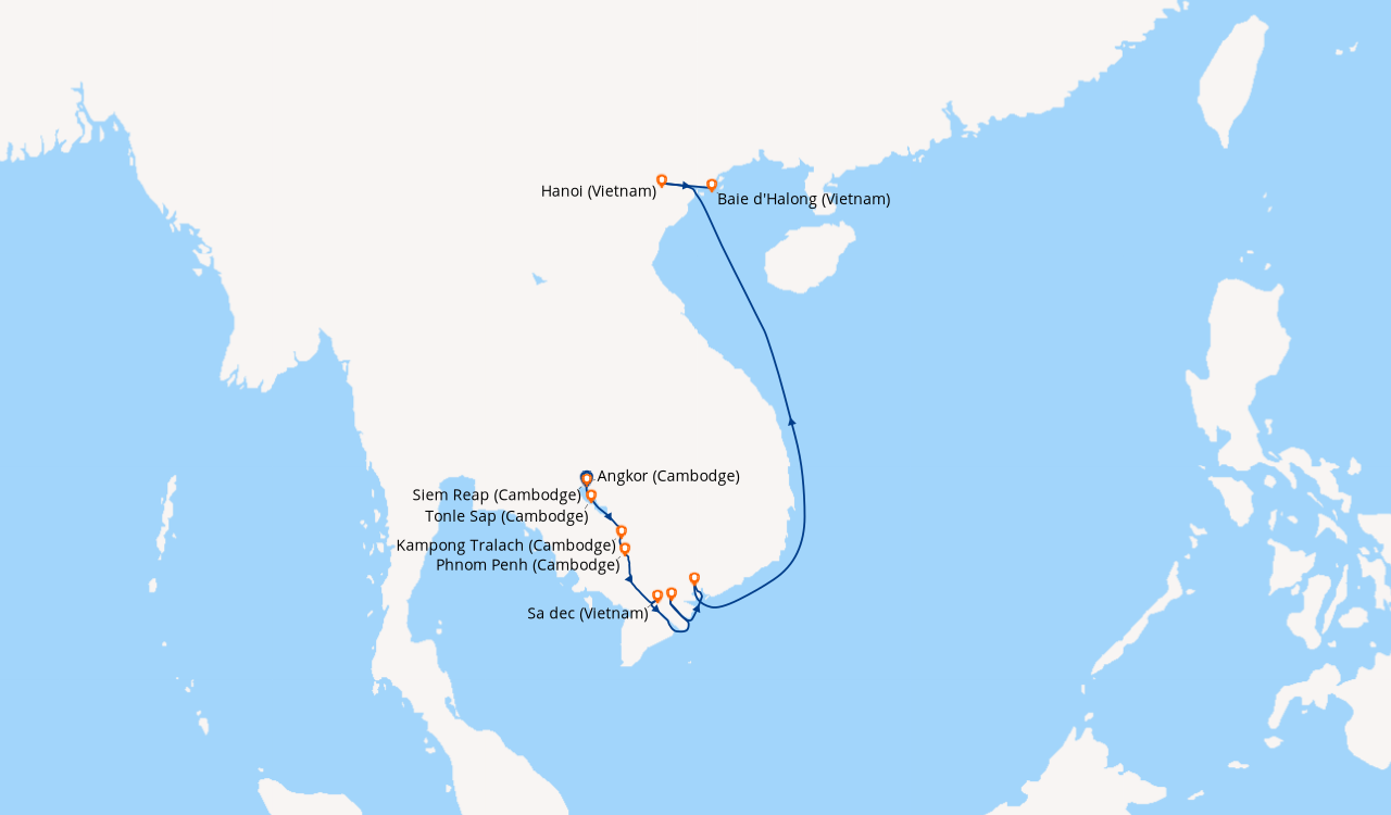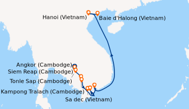 Ravi de mon séjour ! Nous avons essuyé des pluies très fortes (croisière fin maiau départ de Hanoi) ce qui a modifié nos escales à plusieurs reprises. Hio chi minh ville fantastiquement belle !! le canal de chao gao pareil, il y avait plein de petites barques où les commerçants vendaient leurs fruits et légumes. Bonne idée pour les casques guides audio pendant les excursions, comme on venait de pleins de pays différents c'était judicieux.
