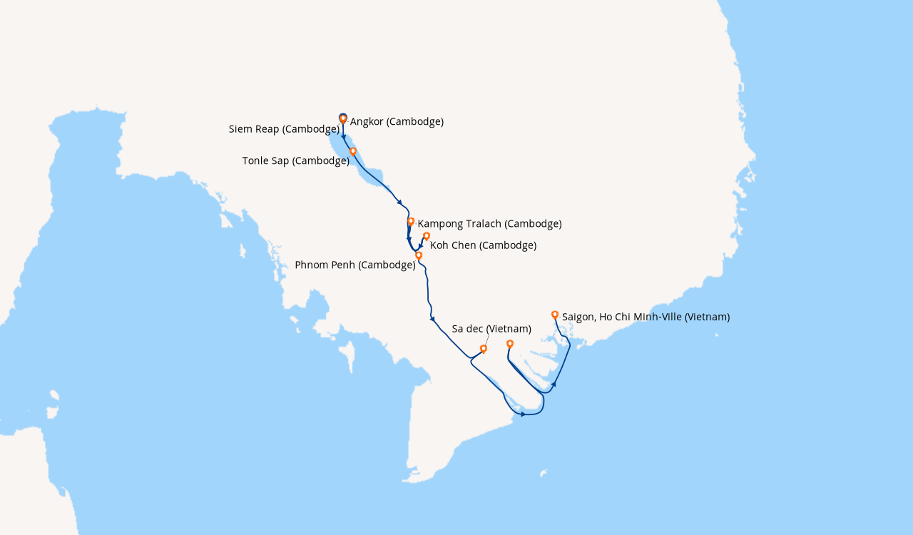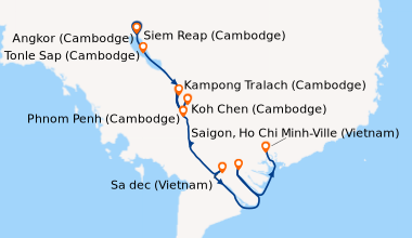 Ravi de mon séjour ! Nous avons essuyé des pluies très fortes (croisière fin maiau départ de Hanoi) ce qui a modifié nos escales à plusieurs reprises. Hio chi minh ville fantastiquement belle !! le canal de chao gao pareil, il y avait plein de petites barques où les commerçants vendaient leurs fruits et légumes. Bonne idée pour les casques guides audio pendant les excursions, comme on venait de pleins de pays différents c'était judicieux.
