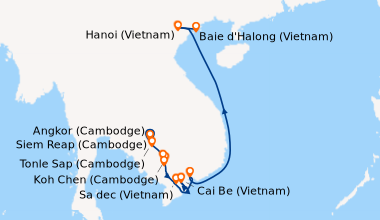 Ravi de mon séjour ! Nous avons essuyé des pluies très fortes (croisière fin maiau départ de Hanoi) ce qui a modifié nos escales à plusieurs reprises. Hio chi minh ville fantastiquement belle !! le canal de chao gao pareil, il y avait plein de petites barques où les commerçants vendaient leurs fruits et légumes. Bonne idée pour les casques guides audio pendant les excursions, comme on venait de pleins de pays différents c'était judicieux.