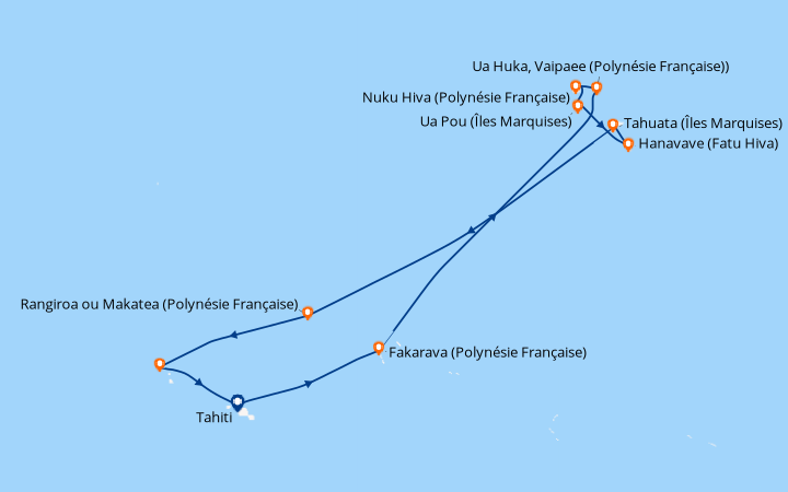 Iles Marquises, Tuamotu et Société Mythique et mystique. Une terre qui a attiré les explorateurs, écrivains, peintres et artistes. Des paysages époustouflants de montagnes, vallées, plateaux et falaises. Une nation d’anciens guerriers, avec leur propre langue et culture. Les Marquises sont un monde à part entière. Depuis 40 ans, l'Aranui, en tant que principal transporteur de marchandises vers les Marquises, entretient un lien vital avec ses habitants.