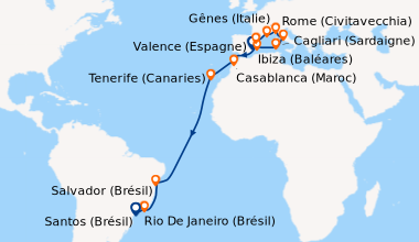 Croisière en Septembre à destination la Méditerranée, embarquement à Gênes. C’est notre première croisière, donc nous ne savions vraiment pas à quoi nous attendre après avoir lu certains commentaires. La cabine est agréable, spacieuse, bien équipée. Nous avons pris tous nos petits déjeuners et déjeuners au restaurant. C’est super de se retrouver avec des compagnons venus de divers horizons. Les tables sont devenus multiculturels ! Nous sommes allés deux fois au buffet, le service est excellent, les serveurs attentionnés. Le forfait ‘boissons tout compris' est bien utile car il couvre les cocktails, cafés, boissons non alcoolisées, eau, café etc…. Nous avons loué une excursion à terre pour la visite de Rome. Comme nous n'avons pas tenu compte du temps qu’il faut pour rejoindre le port à la ville, nous n’avons pas pu faire la totalité de la visite. Pour Palerme et Tunis, nous avons réservé avec la compagnie, aucun problème, bien que Tunis soit une étape à surveiller car il y a de nombreux filous.